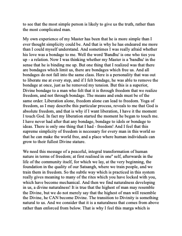 We need this message of a peaceful, integral transformation of human nature in terms of freedom; at first realised in one'' self, afterwards in the life of the community itself, for which we lay, at the very beginning, the foundation in the quality of our Satsangh, where we train people, and we train them in freedom. So the subtle way which is practiced in this system really gives meaning to many of the rites which you have locked with you, which have become mechanical. And then we find naturalness developing in us, a divine naturalness! It is true that the highest of man may resemble the Divine, but we do not merely say that the highest of man will resemble the Divine, he CAN become Divine. The transition to Divinity is something natural to us. And we consider that it is a naturalness that comes from above rather than enforced from below. That is why I feel this marga which is