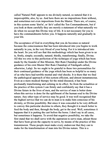The acceptance of God in everything that you do becomes so natural because the consciousness that has been introduced into you begins to work naturally in you, in the very blood of your being. For it is introduced into the heart. So you will see that this methodology which has been given to us is, firstly, simple; secondly, natural; thirdly, transforming; finally, Divine. All this we owe to this perfection of the technique of yoga which has been made by the founder of this Mission, Shri Ram Chandraji under the Divine guidance of his own Master Shri Ram Chandraji of Fatehgarh called, otherwise, Lalaji. So we ought to be grateful to these two personalities for their continued guidance of the yoga which has been so helpful to so many of us who have had terrible mental and vital shocks. It is there that we find the pathological approach of this system efficient, and almost instantaneous. Even as a mere medical therapy for the mind diseased, it has been profoundly transforming and calming in its effect. So from the actualities or the practice of this system I can firmly and confidently say that it has a Divine future in the lives of men, and the service of man is better done when this service is done for the upliftment of the human soul to the Divine nature. Any other type of service may be good. It was well recognised that the highest service that we can do to man is to make him conscious of his divinity, or Divine possibility. But since it was conceded to be very difficult to convey this particular doctrine to others, they thought it is much better to feed the body and then, through the body, get to the soul. Well, sometimes it happens that it is putting the cart before the horse. I don't say in all cases, but sometimes it happens. To avoid that negative possibility, we take the first stand that we shall serve with the aspiration to serve man, atleast those that have been given the capacity to serve, by means of the practice of this transmission. These people must make every endeavour that they can to make for the transformation of man into his Divine nature. This is a