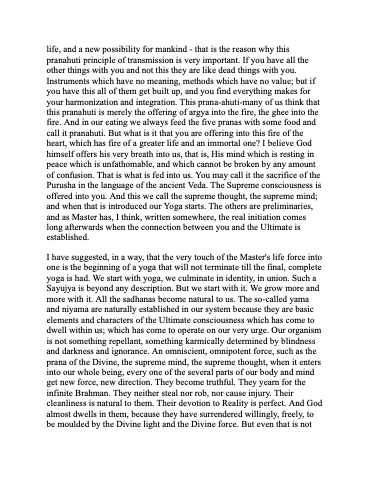 life, and a new possibility for mankind - that is the reason why this pranahuti principle of transmission is very important. If you have all the other things with you and not this they are like dead things with you. Instruments which have no meaning, methods which have no value; but if you have this all of them get built up, and you find everything makes for your harmonization and integration. This prana-ahuti-many of us think that this pranahuti is merely the offering of argya into the fire, the ghee into the fire. And in our eating we always feed the five pranas with some food and call it pranahuti. But what is it that you are offering into this fire of the heart, which has fire of a greater life and an immortal one? I believe God himself offers his very breath into us, that is, His mind which is resting in peace which is unfathomable, and which cannot be broken by any amount of confusion. That is what is fed into us. You may call it the sacrifice of the Purusha in the language of the ancient Veda. The Supreme consciousness is offered into you. And this we call the supreme thought, the supreme mind; and when that is introduced our Yoga starts. The others are preliminaries, and as Master has, I think, written somewhere, the real initiation comes long afterwards when the connection between you and the Ultimate is established.