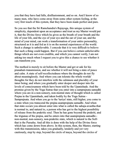 The method is merely to sit before the Master and get or ask for his pranahuti-transmission, and see whether it will not bring a state of peace and calm. A state of self-recollectedness where the thoughts do not fly about meaninglessly. And where you can tolerate the whole worlds' thoughts for they do not interfere with the calmness and placidity of your inner being; and where you gradually enter deeper and deeper into the levels of consciousness which have been told by the Upanishads. And the promise given by the Yoga Sutras that you enter into a samprajnata samadhi where you are in a non-sensory, non-mental state of thought which is called Prajna in the Upanishads, and taken bodily by the Yoga Sutras - Samprajnata. And when you go to the 'turiya' state, still higher, you come to a state when you transcend the prajna-asamprajnata samadhi. And when that state occurs you almost enter into what is called the sahaja-avastha-that is normal to, and natural to, a person who has got to the highest possibility of release from the prakritic soul. Then he has gone beyond the prakriti, and the trigunas of the prajna, and he enters into that asamprajnata samadhi-- non-mental, non-sensory, non-prakritic state, which is natural to the Self- that is the Purusha. And all this is done with the help of the Divine force which has come down from above. In this system, then, the Master, starting with this transmission, takes you gradually, tenderly and yet very cautiously, step by step, beyond the circle of maya, beyond the circles of