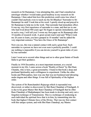 research on Sri Ramanuja. I was attempting this, and I had consulted an astrologer whether I would make good headway in my research on Sri Ramanuja. I then asked him how this prediction could come true when I couldn't find anybody even to teach me the Sri Bhashya! 'Surrender to Sri Ramanuja'-he said! I took him at his word. I quietly stood up and prayed to Sri Ramanuja to help me in the work. That surrender had immediate effect. It was my very first experience of surrender to a man, and that too to one who had lived about 900 years ago! He began to operate immediately, and in such a way, I will tell you! I wrote my first paper on Sri Ramanuja after 10 months of research work. A great savant read it and said "What it took me 20 years to learn, you have grasped in 10 months"-and he added the very important sentence "You have the Grace of Sri Ramanuja".