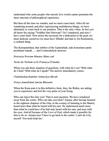 But then all the time we wander, and we must come back. After all our wandering around, and after experiencing multifarious things, we have ultimately to come back to our position. That is the only virtue. In fact you all know the saying "Vriddha Nari Pativrata"! So I wandered, and now I have come back. Now arises the necessity for a dedication to the goal; we must dedicate ourselves-we must have 'Diksha' and that is, for Realization, a cardinal thing.