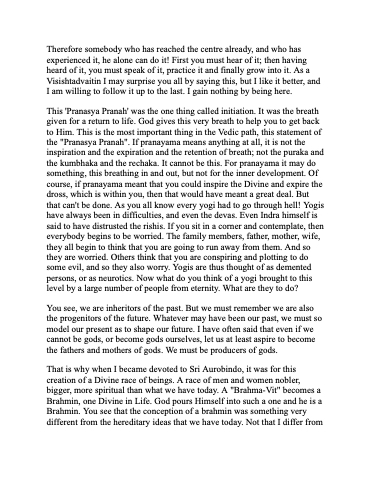 That is why when I became devoted to Sri Aurobindo, it was for this creation of a Divine race of beings. A race of men and women nobler, bigger, more spiritual than what we have today. A "Brahma-Vit" becomes a Brahmin, one Divine in Life. God pours Himself into such a one and he is a Brahmin. You see that the conception of a brahmin was something very different from the hereditary ideas that we have today. Not that I differ from