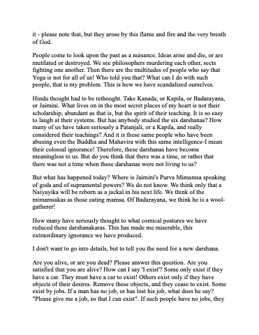 But what has happened today? Where is Jaimini's Purva Mimamsa speaking of gods and of supramental powers? We do not know. We think only that a Naiyayika will be reborn as a jackal in his next life. We think of the mimamsakas as those eating mamsa. Of Badarayana, we think he is a wool- gatherer!