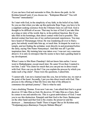 So I start with God, in the simplicity of my faith, in the belief of my faith. So you see that when you take up this particular Raja Yoga, you have to be a suppliant seeking existence from the Ultimate Guru we call God. God is thought to be difficult of access. That may be true of God if you take Him as a king or ruler of the world, that is, in his political function. But if you take Him in his hermitage, then direct contact with God is possible. This desired contact has been one of my earliest personal experiences. You may have heard of Thirumangai Alwar. He was wandering all over to find a guru, but nobody would take him up, or teach him. In despair he went to a temple, and not finding the archakar, went directly in and prostrated before the deity, saying 'Om Namo Narayanaya'. And that was all! I got this inspiration later. My training later was taken over. I was not very conscious about it. It is only in retrospect that He seems to have had a guiding hand in my development.