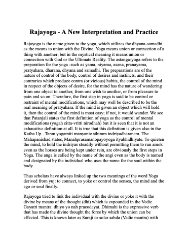 Rajayoga is the name given to the yoga, which utilizes the dhyana-samadhi as the means to union with the Divine. Yoga means union or connection of a thing with another; but in the mystical meaning it means union or connection with God or the Ultimate Reality. The astanga-yoga refers to the preparation for the yoga -such as yama, niyama, asana, pranayama, pratyahara, dharana, dhyana and samadhi. The preparations are of the nature of control of the body, control of desires and instincts, and their contraries which produce contra (or vicious) habits, the control of the mind in respect of the objects of desire, for the mind has the nature of wandering from one object to another, from one wish to another, or from pleasure to pain and so on. Therefore, the first step in yoga is said to be control or restraint of mental modifications, which may well be described to be the real meaning of pratyahara. If the mind is given an object which will hold