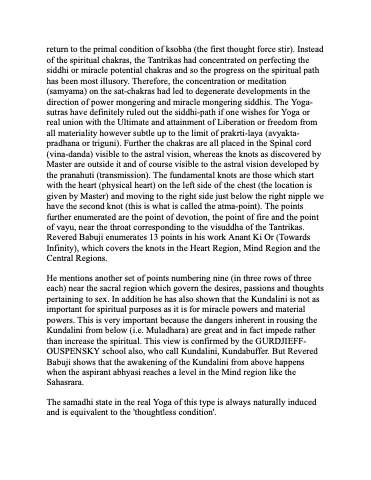 return to the primal condition of ksobha (the first thought force stir). Instead of the spiritual chakras, the Tantrikas had concentrated on perfecting the siddhi or miracle potential chakras and so the progress on the spiritual path has been most illusory. Therefore, the concentration or meditation (samyama) on the sat-chakras had led to degenerate developments in the direction of power mongering and miracle mongering siddhis. The Yoga- sutras have definitely ruled out the siddhi-path if one wishes for Yoga or real union with the Ultimate and attainment of Liberation or freedom from all materiality however subtle up to the limit of prakrti-laya (avyakta- pradhana or triguni). Further the chakras are all placed in the Spinal cord (vina-danda) visible to the astral vision, whereas the knots as discovered by Master are outside it and of course visible to the astral vision developed by the pranahuti (transmission). The fundamental knots are those which start with the heart (physical heart) on the left side of the chest (the location is given by Master) and moving to the right side just below the right nipple we have the second knot (this is what is called the atma-point). The points further enumerated are the point of devotion, the point of fire and the point of vayu, near the throat corresponding to the visuddha of the Tantrikas. Revered Babuji enumerates 13 points in his work Anant Ki Or (Towards Infinity), which covers the knots in the Heart Region, Mind Region and the Central Regions.