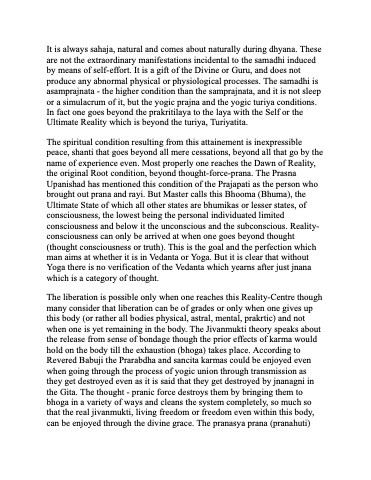 The spiritual condition resulting from this attainement is inexpressible peace, shanti that goes beyond all mere cessations, beyond all that go by the name of experience even. Most properly one reaches the Dawn of Reality, the original Root condition, beyond thought-force-prana. The Prasna Upanishad has mentioned this condition of the Prajapati as the person who brought out prana and rayi. But Master calls this Bhooma (Bhuma), the Ultimate State of which all other states are bhumikas or lesser states, of consciousness, the lowest being the personal individuated limited consciousness and below it the unconscious and the subconscious. Reality- consciousness can only be arrived at when one goes beyond thought (thought consciousness or truth). This is the goal and the perfection which man aims at whether it is in Vedanta or Yoga. But it is clear that without Yoga there is no verification of the Vedanta which yearns after just jnana which is a category of thought.