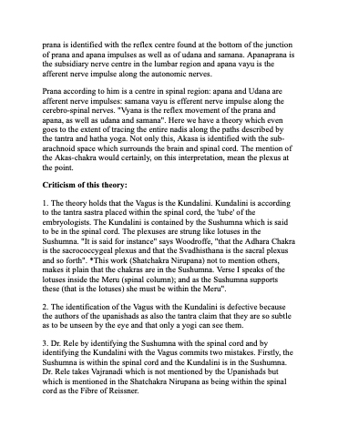 3. Dr. Rele by identifying the Sushumna with the spinal cord and by identifying the Kundalini with the Vagus commits two mistakes. Firstly, the Sushumna is within the spinal cord and the Kundalini is in the Sushumna. Dr. Rele takes Vajranadi which is not mentioned by the Upanishads but which is mentioned in the Shatchakra Nirupana as being within the spinal cord as the Fibre of Reissner.