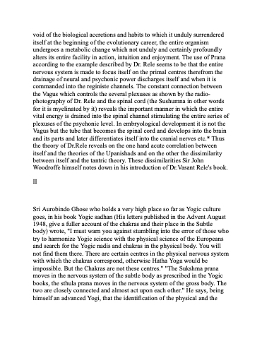 void of the biological accretions and habits to which it unduly surrendered itself at the beginning of the evolutionary career, the entire organism undergoes a metabolic change which not unduly and certainly profoundly alters its entire facility in action, intuition and enjoyment. The use of Prana according to the example described by Dr. Rele seems to be that the entire nervous system is made to focus itself on the primal centres therefrom the drainage of neural and psychonic power discharges itself and when it is commanded into the reginiste channels. The constant connection between the Vagus which controls the several plexuses as shown by the radio- photography of Dr. Rele and the spinal cord (the Sushumna in other words for it is myelinated by it) reveals the important manner in which the entire vital energy is drained into the spinal channel stimulating the entire series of plexuses of the psychonic level. In embryological development it is not the Vagus but the tube that becomes the spinal cord and develops into the brain and its parts and later differentiates itself into the cranial nerves etc.* Thus the theory of Dr.Rele reveals on the one hand acute correlation between itself and the theories of the Upanishads and on the other the dissimilarity between itself and the tantric theory. These dissimilarities Sir John Woodroffe himself notes down in his introduction of Dr.Vasant Rele's book.