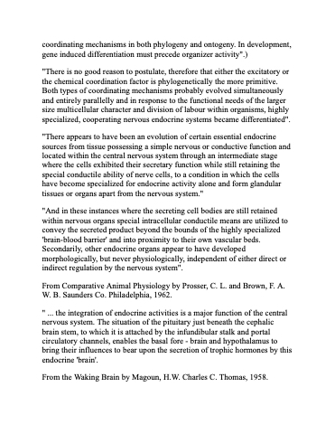 "And in these instances where the secreting cell bodies are still retained within nervous organs special intracellular conductile means are utilized to convey the secreted product beyond the bounds of the highly specialized 'brain-blood barrier' and into proximity to their own vascular beds. Secondarily, other endocrine organs appear to have developed morphologically, but never physiologically, independent of either direct or indirect regulation by the nervous system".