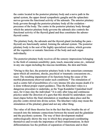 "Owing to this fact, the posterior pituitary body is the sensorium commune upon which all emotions, shocks, psychical or traumatic concussions etc., react. The resulting impairment of its functions being the cause of the morbid phenomena observed under such conditions.* The stimulation of such a centre full of possibilities of a very intense life also means death if it is done without proper expert guidance. Thus the Khechari-vidya is a dangerous procedure to undertake, as the Yoga Kundalini Upanishad itself says, for it may slay the individual." It is only after long and continuous practice under the direction of a guru that this should be undertaken: years must elapse before the final stimulation or manthana takes place and the psychic centre stirred into divine action. The khechari-vidya may mean the stimulation of the pituitary gland and not any other thing.