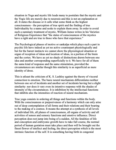 situation in Yoga and mystic life leads many to postulate that the mystic and the Yogic life are merely due to neurosis and this is not an explanation at all. It states the disease or it calls what some think as the highest consciousness - the perception of true spirit and the finding of true Individuality by a name and seeks to explain them away. In order to avoid such a summary treatment of mystic, William James writes in his Varieties of Religious Experience that "the states of consciousness of the mystics have a right and are true to those who have that experience."