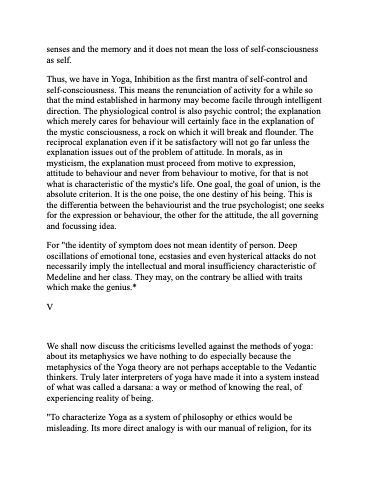 We shall now discuss the criticisms levelled against the methods of yoga: about its metaphysics we have nothing to do especially because the metaphysics of the Yoga theory are not perhaps acceptable to the Vedantic thinkers. Truly later interpreters of yoga have made it into a system instead of what was called a darsana: a way or method of knowing the real, of experiencing reality of being.