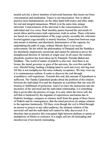 mental activity, a direct intuition of universal harmony that issues out from concentration and meditation. Trance is not intoxication. Nor is ethical practice mere humanization; on the other hand both trance and ethic make for real and integral uniqueness, Which is at the same time unique universal. Consciousness of the universal is the consciousness of the individual and vice versa. Real morality passes beyond the universals of social ethics and becomes truth expression; truth in action. These criticisms are based on a misinterpretation of the yoga system; secondly the criticisms leveled against yoga morality is merely baseless. Connection between yoga and morals is intrinsic and absolutely determinative of the capacity for undertaking the path of yoga; without Morals there is no mystic achievement. On the whole the philosophies of Patanjali and the Samkhya are absolutely empiricistic mysticism and cannot be utilized to prove the metaphysical theories of Advaita or single soul. In all cases, the realistic pluralistic position has been taken up by Patanjali. Purusha Bahutvam Siddham . The world of matter of prakriti is also real. And there is an Isvara, the moral governor or guru of the universe, the ever-free and the ever -blissful being, lending a helping hand to each and every striving soul. All this is not metaphysics but mere ordinary acceptance. We may even say it is commonsense realism. It seeks to discover the real through svanubhava- self-experience. Towards this end, this amount of hypothesis is sufficient. The Varaha Upanishad speaks about the problem of the relation between the individual Jiva and the Supreme as a problem that can wait till fruition or fulfillment of perfection. And if we have the instruction into the mysteries of the universal and the individual relationship, it is something that is given after the practice of yoga. It is only when the lower self, the self that is burdened by the stigmata of experiences and karma due to Prakritic bondage, conquers or releases itself from the grasp of these forces of Prakriti and its consequences, that the mind perceives its unique relation to the supreme luminously. Till then, even though the veil is lifted through an answer to prayer or any other pathway, the intimate relation of the universal self and the individual self cannot be fully discovered. It is therefore that in practice this conceptual fight between dualism or spirits or multiplicity of finites or existence of a single self are all misleading and mischievous if not merely misleading.