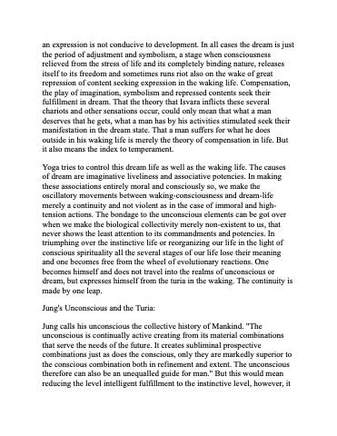 Yoga tries to control this dream life as well as the waking life. The causes of dream are imaginative liveliness and associative potencies. In making these associations entirely moral and consciously so, we make the oscillatory movements between waking-consciousness and dream-life merely a continuity and not violent as in the case of immoral and high- tension actions. The bondage to the unconscious elements can be got over when we make the biological collectivity merely non-existent to us, that never shows the least attention to its commandments and potencies. In triumphing over the instinctive life or reorganizing our life in the light of conscious spirituality all the several stages of our life lose their meaning and one becomes free from the wheel of evolutionary reactions. One becomes himself and does not travel into the realms of unconscious or dream, but expresses himself from the turia in the waking. The continuity is made by one leap.