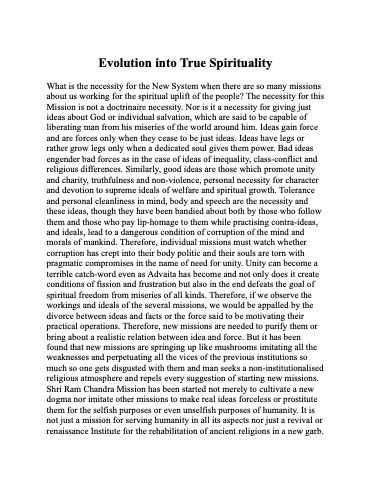 What is the necessity for the New System when there are so many missions about us working for the spiritual uplift of the people? The necessity for this Mission is not a doctrinaire necessity. Nor is it a necessity for giving just ideas about God or individual salvation, which are said to be capable of liberating man from his miseries of the world around him. Ideas gain force and are forces only when they cease to be just ideas. Ideas have legs or rather grow legs only when a dedicated soul gives them power. Bad ideas engender bad forces as in the case of ideas of inequality, class-conflict and religious differences. Similarly, good ideas are those which promote unity and charity, truthfulness and non-violence, personal necessity for character and devotion to supreme ideals of welfare and spiritual growth. Tolerance and personal cleanliness in mind, body and speech are the necessity and these ideas, though they have been bandied about both by those who follow them and those who pay lip-homage to them while practising contra-ideas, and ideals, lead to a dangerous condition of corruption of the mind and morals of mankind. Therefore, individual missions must watch whether corruption has crept into their body politic and their souls are torn with pragmatic compromises in the name of need for unity. Unity can become a terrible catch-word even as Advaita has become and not only does it create conditions of fission and frustration but also in the end defeats the goal of spiritual freedom from miseries of all kinds. Therefore, if we observe the workings and ideals of the several missions, we would be appalled by the divorce between ideas and facts or the force said to be motivating their practical operations. Therefore, new missions are needed to purify them or bring about a realistic relation between idea and force. But it has been found that new missions are springing up like mushrooms imitating all the weaknesses and perpetuating all the vices of the previous institutions so much so one gets disgusted with them and man seeks a non-institutionalised religious atmosphere and repels every suggestion of starting new missions. Shri Ram Chandra Mission has been started not merely to cultivate a new dogma nor imitate other missions to make real ideas forceless or prostitute them for the selfish purposes or even unselfish purposes of humanity. It is not just a mission for serving humanity in all its aspects nor just a revival or renaissance Institute for the rehabilitation of ancient religions in a new garb.