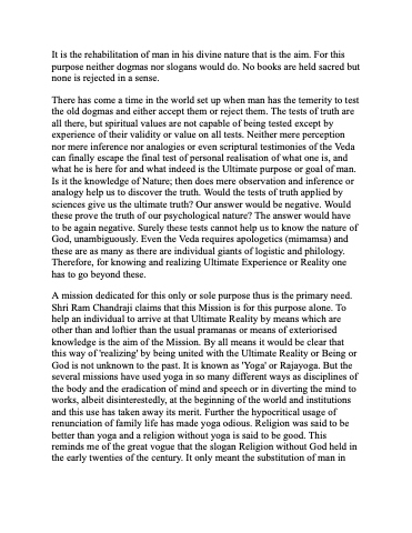 A mission dedicated for this only or sole purpose thus is the primary need. Shri Ram Chandraji claims that this Mission is for this purpose alone. To help an individual to arrive at that Ultimate Reality by means which are other than and loftier than the usual pramanas or means of exteriorised knowledge is the aim of the Mission. By all means it would be clear that this way of 'realizing' by being united with the Ultimate Reality or Being or God is not unknown to the past. It is known as 'Yoga' or Rajayoga. But the several missions have used yoga in so many different ways as disciplines of the body and the eradication of mind and speech or in diverting the mind to works, albeit disinterestedly, at the beginning of the world and institutions and this use has taken away its merit. Further the hypocritical usage of renunciation of family life has made yoga odious. Religion was said to be better than yoga and a religion without yoga is said to be good. This reminds me of the great vogue that the slogan Religion without God held in the early twenties of the century. It only meant the substitution of man in