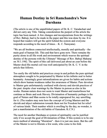 "We are all brethren connected intellectually, morally and spiritually - the main goal of human life. This and that have gone now. There remains the purity alone in all His work and environment which weaves the spiritual destiny of the persons with the Ultimate" Message of Rev. Babuji Maharaj on 30.1.1982. The spirit of this call delivered just about an year before the Master shed His mortal coil was well anticipated by Dr. K. C. V. in the article that follows.