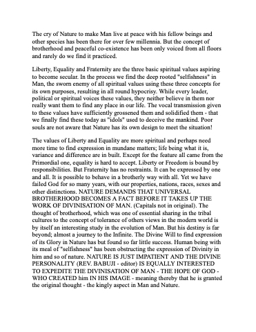 The values of Liberty and Equality are more spiritual and perhaps need more time to find expression in mundane matters; life being what it is, variance and difference are in built. Except for the feature all came from the Primordial one, equality is hard to accept. Liberty or Freedom is bound by responsibilities. But Fraternity has no restraints. It can be expressed by one and all. It is possible to behave in a brotherly way with all. Yet we have failed God for so many years, with our properties, nations, races, sexes and other distinctions. NATURE DEMANDS THAT UNIVERSAL BROTHERHOOD BECOMES A FACT BEFORE IT TAKES UP THE WORK OF DIVINISATION OF MAN. (Capitals not in original). The thought of brotherhood, which was one of essential sharing in the tribal cultures to the concept of tolerance of others views in the modern world is by itself an interesting study in the evolution of Man. But his destiny is far beyond; almost a journey to the Infinite. The Divine Will to find expression of its Glory in Nature has but found so far little success. Human being with its meal of "selfishness" has been obstructing the expression of Divinity in him and so of nature. NATURE IS JUST IMPATIENT AND THE DIVINE PERSONALITY (REV. BABUJI - editor) IS EQUALLY INTERESTED TO EXPEDITE THE DIVINISATION OF MAN - THE HOPE OF GOD - WHO CREATED him IN HIS IMAGE - meaning thereby that he is granted the original thought - the kingly aspect in Man and Nature.