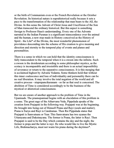 or the birth of Communism even or the French Revolution or the October Revolution. Its historical nature is suprahistorical really because it sets a pace to the transformation of the relationship that man bears to the All, the Divine. In this sense the Advent of Christ Jesus and Crucifixion of the Son of Man transcend the ordinary historical. But this aspect is something foreign to Professor Haas's understanding. Every one of the Advents narrated in the Indian Puranas is a significant transcendence over the animal and the human, a new step made in History conceived as the History of Spirit - the Lila* of the Divine, the most wonderful phenomenon of providence descending into the scheme of His creation to give meaning and direction and eternity to the temporal play of events and planes and personalities.