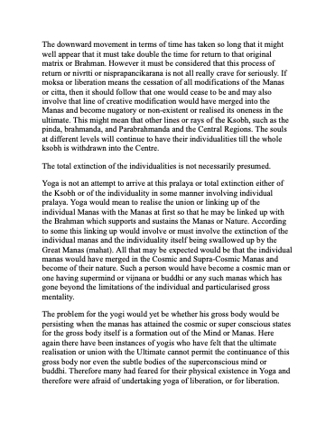 Yoga is not an attempt to arrive at this pralaya or total extinction either of the Ksobh or of the individuality in some manner involving individual pralaya. Yoga would mean to realise the union or linking up of the individual Manas with the Manas at first so that he may be linked up with the Brahman which supports and sustains the Manas or Nature. According to some this linking up would involve or must involve the extinction of the individual manas and the individuality itself being swallowed up by the Great Manas (mahat). All that may be expected would be that the individual manas would have merged in the Cosmic and Supra-Cosmic Manas and become of their nature. Such a person would have become a cosmic man or one having supermind or vijnana or buddhi or any such manas which has gone beyond the limitations of the individual and particularised gross mentality.