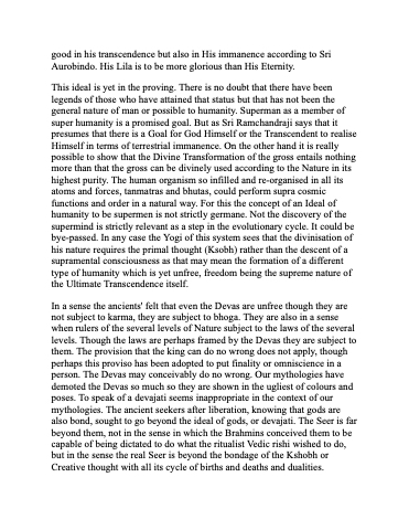 This ideal is yet in the proving. There is no doubt that there have been legends of those who have attained that status but that has not been the general nature of man or possible to humanity. Superman as a member of super humanity is a promised goal. But as Sri Ramchandraji says that it presumes that there is a Goal for God Himself or the Transcendent to realise Himself in terms of terrestrial immanence. On the other hand it is really possible to show that the Divine Transformation of the gross entails nothing more than that the gross can be divinely used according to the Nature in its highest purity. The human organism so infilled and re-organised in all its atoms and forces, tanmatras and bhutas, could perform supra cosmic functions and order in a natural way. For this the concept of an Ideal of humanity to be supermen is not strictly germane. Not the discovery of the supermind is strictly relevant as a step in the evolutionary cycle. It could be bye-passed. In any case the Yogi of this system sees that the divinisation of his nature requires the primal thought (Ksobh) rather than the descent of a supramental consciousness as that may mean the formation of a different type of humanity which is yet unfree, freedom being the supreme nature of the Ultimate Transcendence itself.