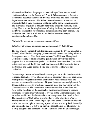 when realised leads to the proper understanding of the transcendental relationship between the Purusa and Prakrti. When nearness is forgotten then manas becomes distorted or inverted or knotted and leads to all the degradations and misuses of it. When the reminiscence of nearness or proximity that is basic to organic evolution in the supra-cosmic, cosmic, and individual organism is brought back there arises the harmony of all being. This is about the simplest way of doing it- through transmission of the Divine Thought in its primordial condition into the heart of man. The realisation that God is in all and all are in God seems to happen spontaneously and speedily.