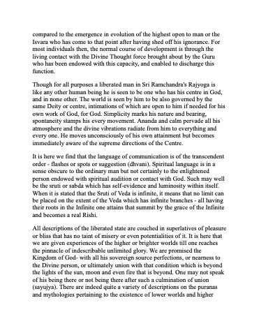 Though for all purposes a liberated man in Sri Ramchandra's Rajyoga is like any other human being he is seen to be one who has his centre in God, and in none other. The world is seen by him to be also governed by the same Deity or centre, intimations of which are open to him if needed for his own work of God, for God. Simplicity marks his nature and bearing, spontaneity stamps his every movement. Ananda and calm pervade all his atmosphere and the divine vibrations radiate from him to everything and every one. He moves unconsciously of his own attainment but becomes immediately aware of the supreme directions of the Centre.