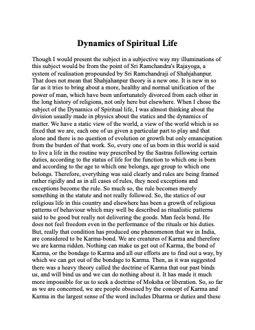 Though I would present the subject in a subjective way my illuminations of this subject would be from the point of Sri Ramchandra's Rajayoga, a system of realisation propounded by Sri Ramchandraji of Shahjahanpur. That does not mean that Shahjahanpur theory is a new one. It is new in so far as it tries to bring about a more, healthy and normal unification of the power of man, which have been unfortunately divorced from each other in the long history of religions, not only here but elsewhere. When I chose the subject of the Dynamics of Spiritual life, I was almost thinking about the division usually made in physics about the statics and the dynamics of matter. We have a static view of the world, a view of the world which is so fixed that we are, each one of us given a particular part to play and that alone and there is no question of evolution or growth but only emancipation from the burden of that work. So, every one of us born in this world is said to live a life in the routine way prescribed by the Sastras following certain duties, according to the status of life for the function to which one is born and according to the age to which one belongs, age group to which one belongs. Therefore, everything was said clearly and rules are being framed rather rigidly and as in all cases of rules, they need exceptions and exceptions become the rule. So much so, the rule becomes merely something in the statute and not really followed. So, the statics of our religious life in this country and elsewhere has been a growth of religious patterns of behaviour which may well be described as ritualistic patterns said to be good but really not delivering the goods. Man feels bond. He does not feel freedom even in the performance of the rituals or his duties. But, really that condition has produced one phenomenon that we in India, are considered to be Karma-bond. We are creatures of Karma and therefore we are karma ridden. Nothing can make us get out of Karma, the bond of Karma, or the bondage to Karma and all our efforts are to find out a way, by which we can get out of the bondage to Karma. Then, as it was suggested there was a heavy theory called the doctrine of Karma that our past binds us, and will bind us and we can do nothing about it. It has made it much more impossible for us to seek a doctrine of Moksha or liberation. So, so far as we are concerned, we are people obsessed by the concept of Karma and Karma in the largest sense of the word includes Dharma or duties and these