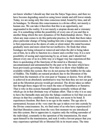 not know whether I should say that was the Satya Yuga since, and then we have become degrading ourselves using lower minds and still lower minds. Today, we are using only this time conscious mind, bound by time, and all its bondages. To liberate this consciousness is a divine effort, not merely a human one. We can take it therefore that this is an opportunity, not ungrounded in the reality. It is not merely a utopian dream and a visionary one. It is something within the possibility of every one of you and this is another thing which the new dynamics of Sri Ramchandraji shows. That is when any man comes to do this particular practice, he finds that there takes place particular change of being leading him into a larger consciousness. It is first experienced as the dawn of calm or silent mind. His mind becomes gradually more and more silent but not ineffective. He finds that when bondages are being released or removed and when the dirt is being taken out of him, he is able to function in a clearer and a swifter way. It is a new possibility of seeing and experiencing by us, at least, and I should feel almost every one of us in a little way or a bigger way has experienced this there is quickening of the functions of the mind in a liberated way, uncontaminated and untrammelled by the past or by the rules which have been previously governing matter. Now that is to show what Siddhis are available within this system. But we do not pursue the Siddhis for the sake of Siddhis. The Siddhis are natural products due to the liberation of the mind from the trammels of its own past or Vasanas or desires. Now all this is achieved in an absolutely unobstrusive way but then they are not our goal and as the liberation process would get arrested. The divine takes us rather fast through those stages till we reach the state of Samabhava or Samatva. That is why in this system Samadfii happens normally without all that which go on in that obstinate way of human effort. That is why it is so easy to have the Sarnadhi state and also the Sahaja condition to feel that you are always in that free condition. The mind does, not seem to be bond. It experiences freedom. But there is no ego in the matter. The ego also is surmounted, because at the -very start the ego is taken over into custody by the Divine consciousness. So, we find some of us who have experienced it find that liberation comes from the very first moment we are introduced into this system. But to appreciate it, requires only the willing surrender of the individual, constantly to the operation of the transmission, He must open himself to the transmission, and seek it with a fervent prayer that you may experience spiritual life or liberated life in its truest sense. The time