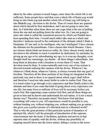 taken by the other systems is much longer, some times the whole life is not sufficient. Some people have said that even a whole life of Karm yog would bring us into Gnan yog and another whole life of Gnan yog will bring us into Bhakthi yog - devotion to the divine. Then of course there are quarrels about which should be first undertaken, and I am not going to enter into that. As I hold that when these three are one yoga what is the use of pulling down the one and not pulling down the other two. So, I am not going to enter into what is called the casuistical process by which our Pundits have been spending their time. I would much rather take man as a whole and therefore l dedicate myself to the realisation of the ultimate which I think is Parajnana. If I am said ,to be intelligent, why am l intelligent? I have chosen the ultimate not the penultimate. I have chosen that which liberates. I have not chosen which binds me however softly. So l have chosen wisely and my devotion to the ultimate to reach it somehow by dedication, by surrender, by giving up my ego or by subordinating my ego, to it even my thoughts, even thought itself my reasonings, my doubts - all these things l subordinate. Just keep them in abeyance with a freedom to revise them if I want. That devotion must be there. It comes naturally and every one of my actions is directed towards realising this oneness with the divine. Whatever I do, whatever I think about, whatever I desire, is always towards that one goal of freedom. Therefore all the three portions of my being are integrated in this particular way and so there is no quarrel about which yoga I shall follow and therefore I need not take many births in order to realise God. They say it is much richer to go through every experience and then finally achieve the ultimate and then if you want that kind of going about every experience not one life, but many lives or millions of lives will be necessary before you reach God. But supposing a man reaches God first, and all these things are given to him and he knows and understands his real nature, is it not a much shorter way? Therefore our people stated "first know God and then everything will come to you. All experiences would be possible to you, without binding you, without tempting you, without making you go astray - this gives you a perfect picture of a liberated man in a liberated world". That is why the great promise of this particular system of dynamics of spiritual life, which I call the principle of introduction of the supreme consciousness into the heart. It facilitates, quickens and arrives at that supreme state of equality with the divine, without any possibility of stepping oneself down into the lower nature, falling a victim to the lower