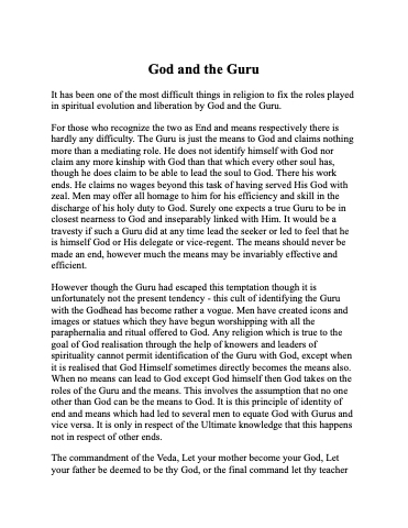 For those who recognize the two as End and means respectively there is hardly any difficulty. The Guru is just the means to God and claims nothing more than a mediating role. He does not identify himself with God nor claim any more kinship with God than that which every other soul has, though he does claim to be able to lead the soul to God. There his work ends. He claims no wages beyond this task of having served His God with zeal. Men may offer all homage to him for his efficiency and skill in the discharge of his holy duty to God. Surely one expects a true Guru to be in closest nearness to God and inseparably linked with Him. It would be a travesty if such a Guru did at any time lead the seeker or led to feel that he is himself God or His delegate or vice-regent. The means should never be made an end, however much the means may be invariably effective and efficient.