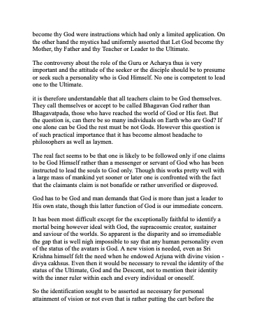 It has been most difficult except for the exceptionally faithful to identify a mortal being however ideal with God, the supracosmic creator, sustainer and saviour of the worlds. So apparent is the disparity and so irremediable the gap that is well nigh impossible to say that any human personality even of the status of the avatars is God. A new vision is needed, even as Sri Krishna himself felt the need when he endowed Arjuna with divine vision - divya cakhsus. Even then it would be necessary to reveal the identity of the status of the Ultimate, God and the Descent, not to mention their identity with the inner ruler within each and every individual or oneself.