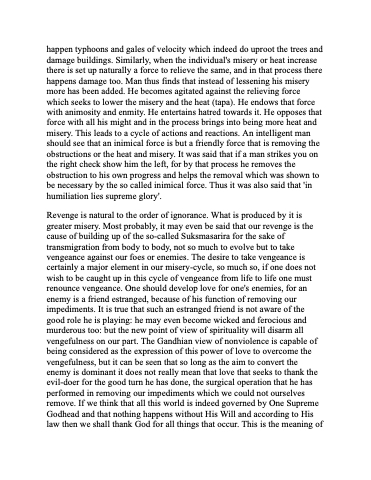 Revenge is natural to the order of ignorance. What is produced by it is greater misery. Most probably, it may even be said that our revenge is the cause of building up of the so-called Suksmasarira for the sake of transmigration from body to body, not so much to evolve but to take vengeance against our foes or enemies. The desire to take vengeance is certainly a major element in our misery-cycle, so much so, if one does not wish to be caught up in this cycle of vengeance from life to life one must renounce vengeance. One should develop love for one's enemies, for an enemy is a friend estranged, because of his function of removing our impediments. It is true that such an estranged friend is not aware of the good role he is playing: he may even become wicked and ferocious and murderous too: but the new point of view of spirituality will disarm all vengefulness on our part. The Gandhian view of nonviolence is capable of being considered as the expression of this power of love to overcome the vengefulness, but it can be seen that so long as the aim to convert the enemy is dominant it does not really mean that love that seeks to thank the evil-doer for the good turn he has done, the surgical operation that he has performed in removing our impediments which we could not ourselves remove. If we think that all this world is indeed governed by One Supreme Godhead and that nothing happens without His Will and according to His law then we shall thank God for all things that occur. This is the meaning of