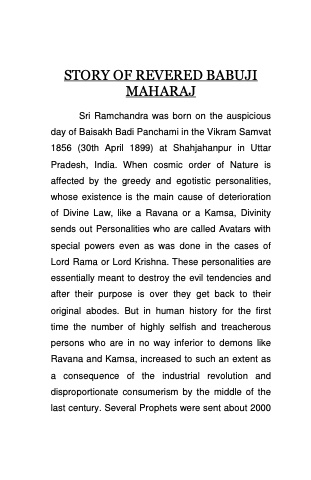 Sri Ramchandra was born on the auspicious day of Baisakh Badi Panchami in the Vikram Samvat 1856 (30th April 1899) at Shahjahanpur in Uttar Pradesh, India. When cosmic order of Nature is affected by the greedy and egotistic personalities, whose existence is the main cause of deterioration of Divine Law, like a Ravana or a Kamsa, Divinity sends out Personalities who are called Avatars with special powers even as was done in the cases of Lord Rama or Lord Krishna. These personalities are essentially meant to destroy the evil tendencies and after their purpose is over they get back to their original abodes. But in human history for the first time the number of highly selfish and treacherous persons who are in no way inferior to demons like Ravana and Kamsa, increased to such an extent as a consequence of the industrial revolution and disproportionate consumerism by the middle of the last century. Several Prophets were sent about 2000