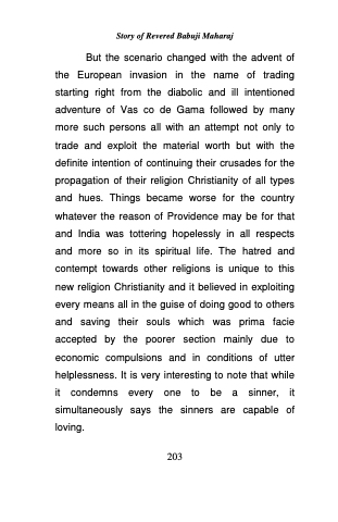 But the scenario changed with the advent of the European invasion in the name of trading starting right from the diabolic and ill intentioned adventure of Vas co de Gama followed by many more such persons all with an attempt not only to trade and exploit the material worth but with the definite intention of continuing their crusades for the propagation of their religion Christianity of all types and hues. Things became worse for the country whatever the reason of Providence may be for that and India was tottering hopelessly in all respects and more so in its spiritual life. The hatred and contempt towards other religions is unique to this new religion Christianity and it believed in exploiting every means all in the guise of doing good to others and saving their souls which was prima facie accepted by the poorer section mainly due to economic compulsions and in conditions of utter helplessness. It is very interesting to note that while it condemns every one to be a sinner, it simultaneously says the sinners are capable of loving.