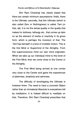 Shri Ram Chandraji has clearly stated that there are certain minimum assumptions: firstly, there is the Ultimate; secondly, that this Ultimate (which is also called Zero or Nothingness) is called Tam (or that, tat). It is not the tamas quality or the quality that makes for dullness, lethargy etc., that comes up later on as the element of inertia or inactivity in its gross form, which is perhaps the inversion of that. The Tam has beneath it a kind of invisible motion. This is the first Mind or Supermind of the Almighty. From this superconscious mind our own mind originates. When we take up our individual mind to this level of the First Mind, then we come close to the Centre or the Almighty.