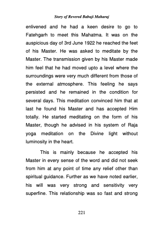 enlivened and he had a keen desire to go to Fatehgarh to meet this Mahatma. It was on the auspicious day of 3rd June 1922 he reached the feet of his Master. He was asked to meditate by the Master. The transmission given by his Master made him feel that he had moved upto a level where the surroundings were very much different from those of the external atmosphere. This feeling he says persisted and he remained in the condition for several days. This meditation convinced him that at last he found his Master and has accepted Him totally. He started meditating on the form of his Master, though he advised in his system of Raja yoga meditation on the Divine light without luminosity in the heart.