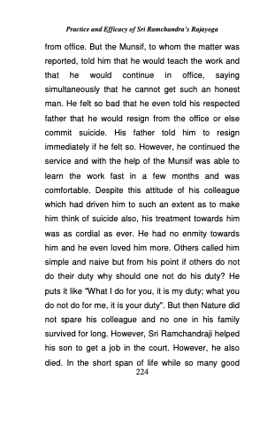 from office. But the Munsif, to whom the matter was reported, told him that he would teach the work and that he would continue in office, saying simultaneously that he cannot get such an honest man. He felt so bad that he even told his respected father that he would resign from the office or else commit suicide. His father told him to resign immediately if he felt so. However, he continued the service and with the help of the Munsif was able to learn the work fast in a few months and was comfortable. Despite this attitude of his colleague which had driven him to such an extent as to make him think of suicide also, his treatment towards him was as cordial as ever. He had no enmity towards him and he even loved him more. Others called him simple and naive but from his point if others do not do their duty why should one not do his duty? He puts it like "What I do for you, it is my duty; what you do not do for me, it is your duty". But then Nature did not spare his colleague and no one in his family survived for long. However, Sri Ramchandraji helped his son to get a job in the court. However, he also