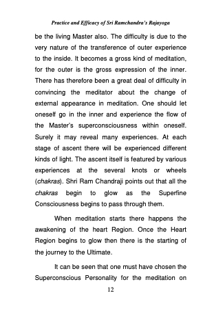 be the living Master also. The difficulty is due to the very nature of the transference of outer experience to the inside. It becomes a gross kind of meditation, for the outer is the gross expression of the inner. There has therefore been a great deal of difficulty in convincing the meditator about the change of external appearance in meditation. One should let oneself go in the inner and experience the flow of the Master’s superconsciousness within oneself. Surely it may reveal many experiences. At each stage of ascent there will be experienced different kinds of light. The ascent itself is featured by various experiences at the several knots or wheels (chakras). Shri Ram Chandraji points out that all the chakras begin to glow as the Superfine Consciousness begins to pass through them.