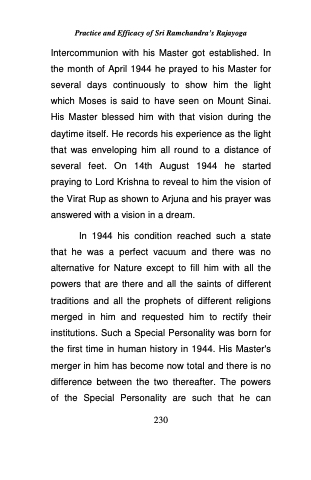 Intercommunion with his Master got established. In the month of April 1944 he prayed to his Master for several days continuously to show him the light which Moses is said to have seen on Mount Sinai. His Master blessed him with that vision during the daytime itself. He records his experience as the light that was enveloping him all round to a distance of several feet. On 14th August 1944 he started praying to Lord Krishna to reveal to him the vision of the Virat Rup as shown to Arjuna and his prayer was answered with a vision in a dream.