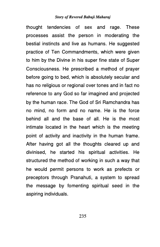 thought tendencies of sex and rage. These processes assist the person in moderating the bestial instincts and live as humans. He suggested practice of Ten Commandments, which were given to him by the Divine in his super fine state of Super Consciousness. He prescribed a method of prayer before going to bed, which is absolutely secular and has no religious or regional over tones and in fact no reference to any God so far imagined and projected by the human race. The God of Sri Ramchandra has no mind, no form and no name. He is the force behind all and the base of all. He is the most intimate located in the heart which is the meeting point of activity and inactivity in the human frame. After having got all the thoughts cleared up and divinised, he started his spiritual activities. He structured the method of working in such a way that he would permit persons to work as prefects or preceptors through Pranahuti, a system to spread the message by fomenting spiritual seed in the aspiring individuals.