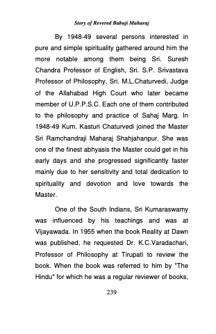 By 1948-49 several persons interested in pure and simple spirituality gathered around him the more notable among them being Sri. Suresh Chandra Professor of English, Sri. S.P. Srivastava Professor of Philosophy, Sri. M.L.Chaturvedi, Judge of the Allahabad High Court who later became member of U.P.P.S.C. Each one of them contributed to the philosophy and practice of Sahaj Marg. In 1948-49 Kum. Kasturi Chaturvedi joined the Master Sri Ramchandraji Maharaj Shahjahanpur. She was one of the finest abhyasis the Master could get in his early days and she progressed significantly faster mainly due to her sensitivity and total dedication to spirituality and devotion and love towards the Master.