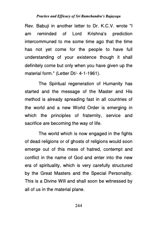 Rev. Babuji in another letter to Dr. K.C.V. wrote "I am reminded of Lord Krishna's prediction intercommuned to me some time ago that the time has not yet come for the people to have full understanding of your existence though it shall definitely come but only when you have given up the material form." (Letter Dt/- 4-1-1961).