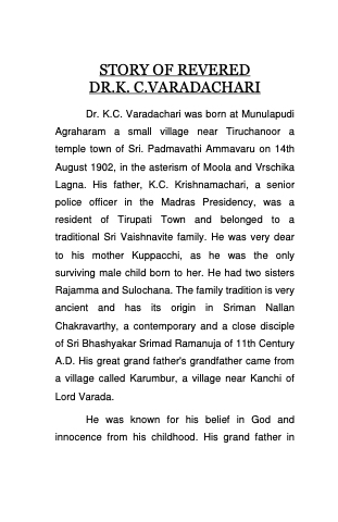 Dr. K.C. Varadachari was born at Munulapudi Agraharam a small village near Tiruchanoor a temple town of Sri. Padmavathi Ammavaru on 14th August 1902, in the asterism of Moola and Vrschika Lagna. His father, K.C. Krishnamachari, a senior police officer in the Madras Presidency, was a resident of Tirupati Town and belonged to a traditional Sri Vaishnavite family. He was very dear to his mother Kuppacchi, as he was the only surviving male child born to her. He had two sisters Rajamma and Sulochana. The family tradition is very ancient and has its origin in Sriman Nallan Chakravarthy, a contemporary and a close disciple of Sri Bhashyakar Srimad Ramanuja of 11th Century A.D. His great grand father's grandfather came from a village called Karumbur, a village near Kanchi of Lord Varada.