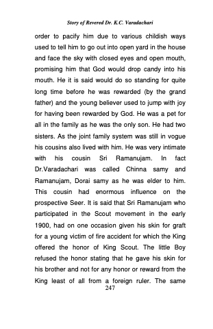 order to pacify him due to various childish ways used to tell him to go out into open yard in the house and face the sky with closed eyes and open mouth, promising him that God would drop candy into his mouth. He it is said would do so standing for quite long time before he was rewarded (by the grand father) and the young believer used to jump with joy for having been rewarded by God. He was a pet for all in the family as he was the only son. He had two sisters. As the joint family system was still in vogue his cousins also lived with him. He was very intimate with his cousin Sri Ramanujam. In fact Dr.Varadachari was called Chinna samy and Ramanujam, Dorai samy as he was elder to him. This cousin had enormous influence on the prospective Seer. It is said that Sri Ramanujam who participated in the Scout movement in the early 1900, had on one occasion given his skin for graft for a young victim of fire accident for which the King offered the honor of King Scout. The little Boy refused the honor stating that he gave his skin for his brother and not for any honor or reward from the