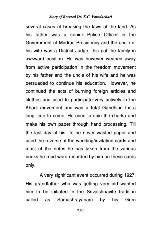 several cases of breaking the laws of the land. As his father was a senior Police Officer in the Government of Madras Presidency and the uncle of his wife was a District Judge, this put the family in awkward position. He was however weaned away from active participation in the freedom movement by his father and the uncle of his wife and he was persuaded to continue his education. However, he continued the acts of burning foreign articles and clothes and used to participate very actively in the Khadi movement and was a total Gandhian for a long time to come. He used to spin the charka and make his own paper through hand processing. Till the last day of his life he never wasted paper and used the reverse of the wedding/invitation cards and most of the notes he has taken from the various books he read were recorded by him on these cards only.