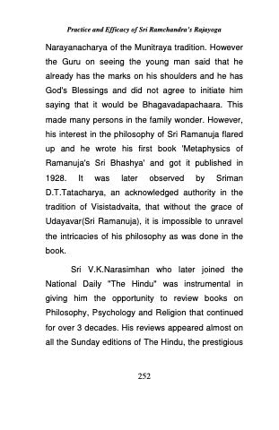 Narayanacharya of the Munitraya tradition. However the Guru on seeing the young man said that he already has the marks on his shoulders and he has God's Blessings and did not agree to initiate him saying that it would be Bhagavadapachaara. This made many persons in the family wonder. However, his interest in the philosophy of Sri Ramanuja flared up and he wrote his first book 'Metaphysics of Ramanuja's Sri Bhashya' and got it published in 1928. It was later observed by Sriman D.T.Tatacharya, an acknowledged authority in the tradition of Visistadvaita, that without the grace of Udayavar(Sri Ramanuja), it is impossible to unravel the intricacies of his philosophy as was done in the book.
