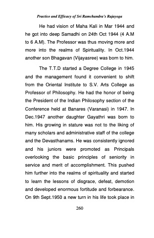The T.T.D started a Degree College in 1945 and the management found it convenient to shift from the Oriental Institute to S.V. Arts College as Professor of Philosophy. He had the honor of being the President of the Indian Philosophy section of the Conference held at Banares (Varanasi) in 1947. In Dec.1947 another daughter Gayathri was born to him. His growing in stature was not to the liking of many scholars and administrative staff of the college and the Devasthanams. He was consistently ignored and his juniors were promoted as Principals overlooking the basic principles of seniority in service and merit of accomplishment. This pushed him further into the realms of spirituality and started to learn the lessons of disgrace, defeat, demotion and developed enormous fortitude and forbearance. On 9th Sept.1950 a new turn in his life took place in